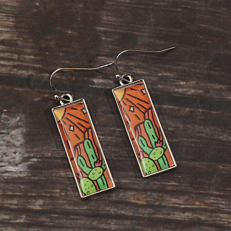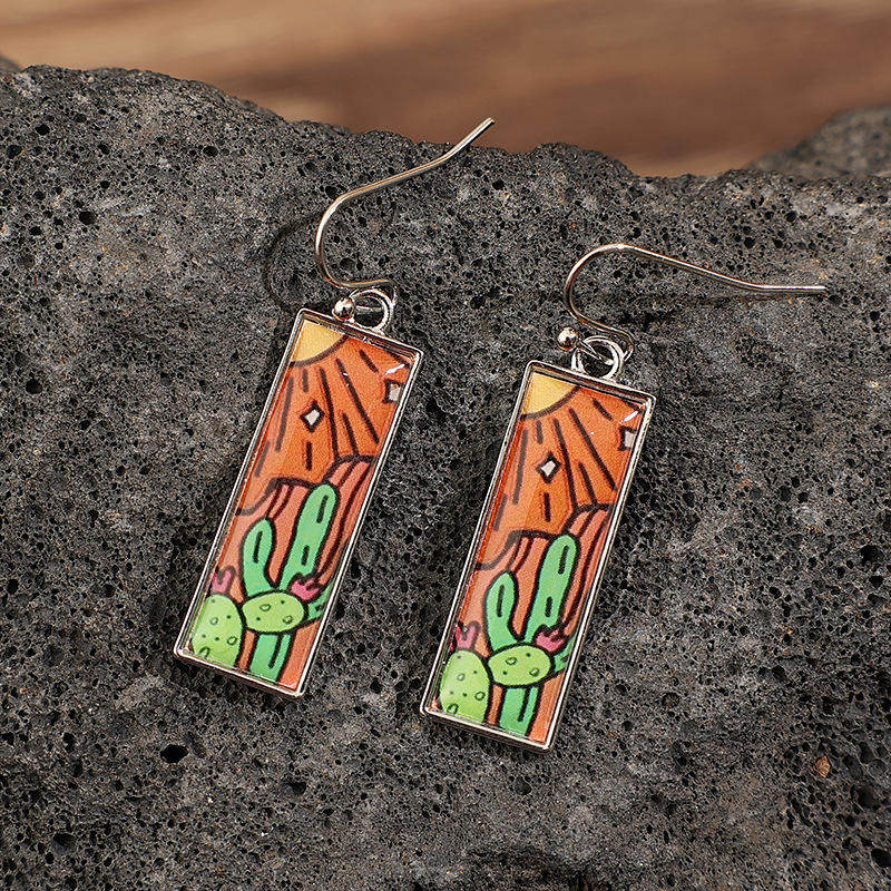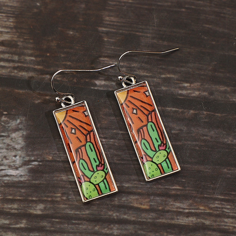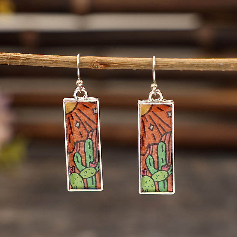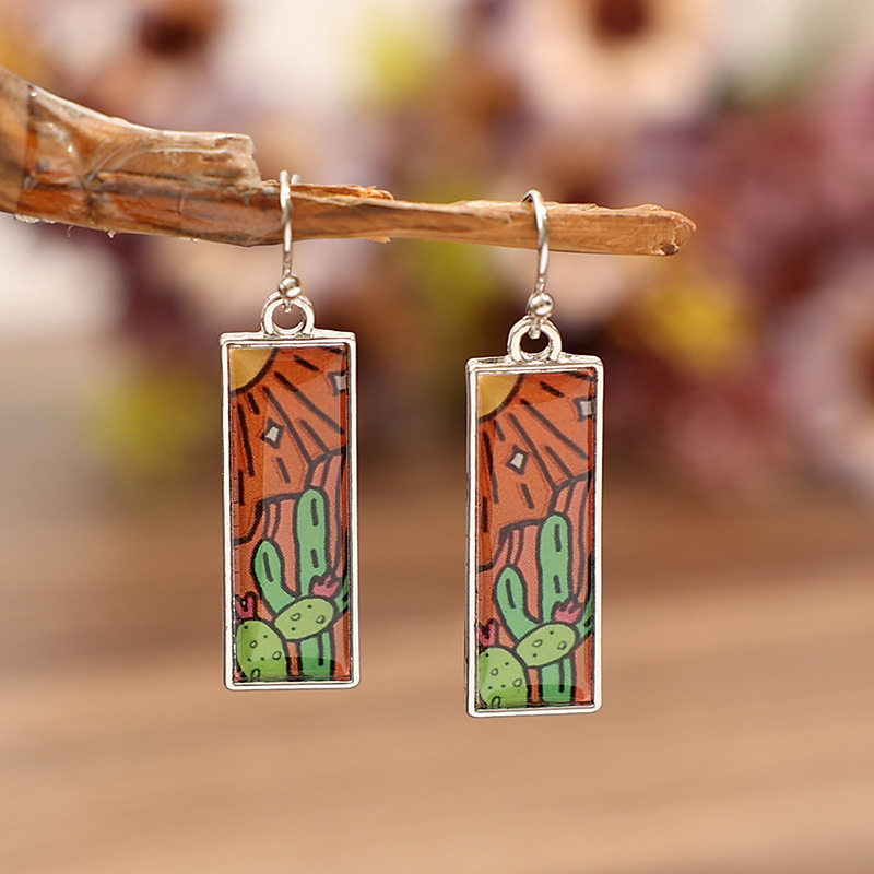 3E3C Tribal Style Cactus Sun Rectangle Alloy Earrings | Sticker Detail Bohemian Statement Jewelry for Women