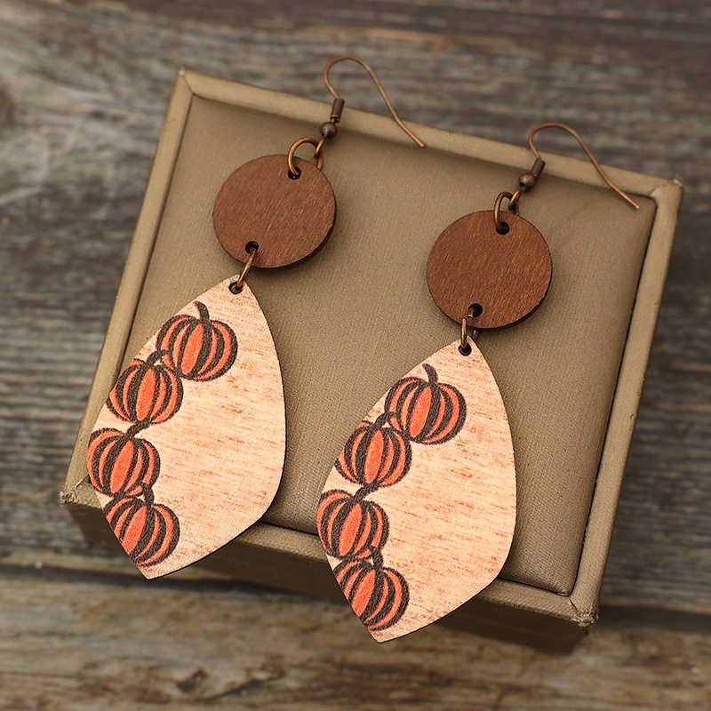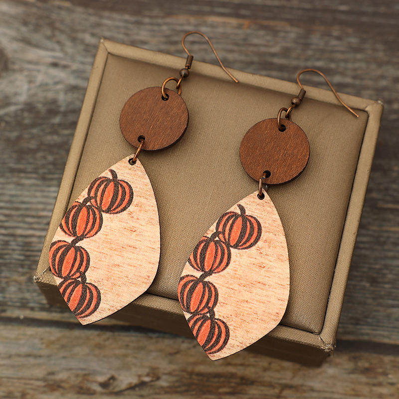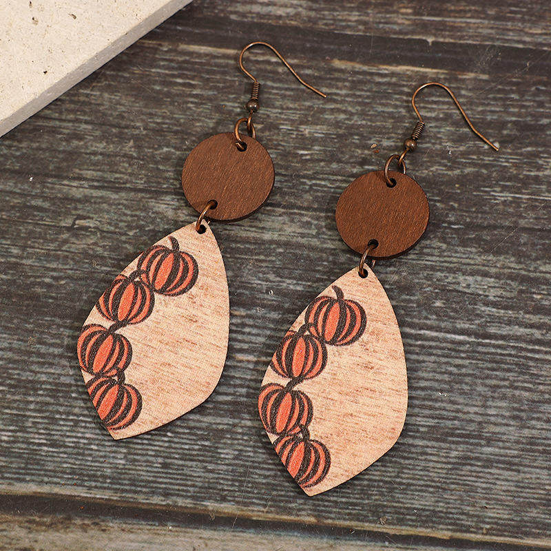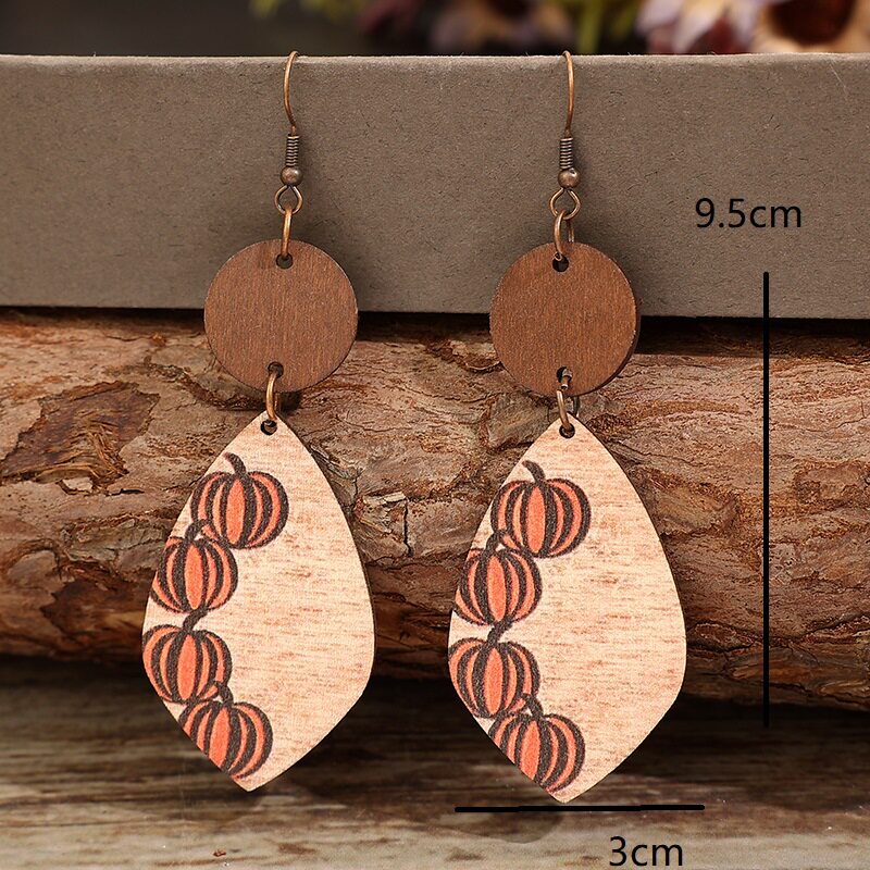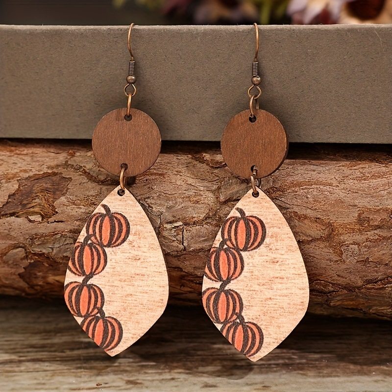 3E3C Vintage Halloween Earrings | Creative Minimalist Patchwork Pumpkin Wooden Statement Dangle Earrings