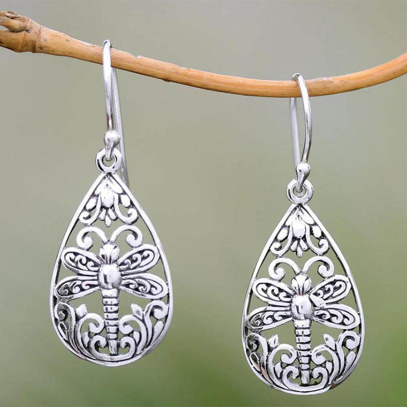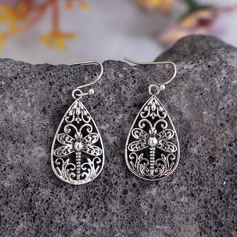 3E3C Vintage Hollow Dragonfly Earrings | Ethnic Style Carved Teardrop Statement Dangle Earrings