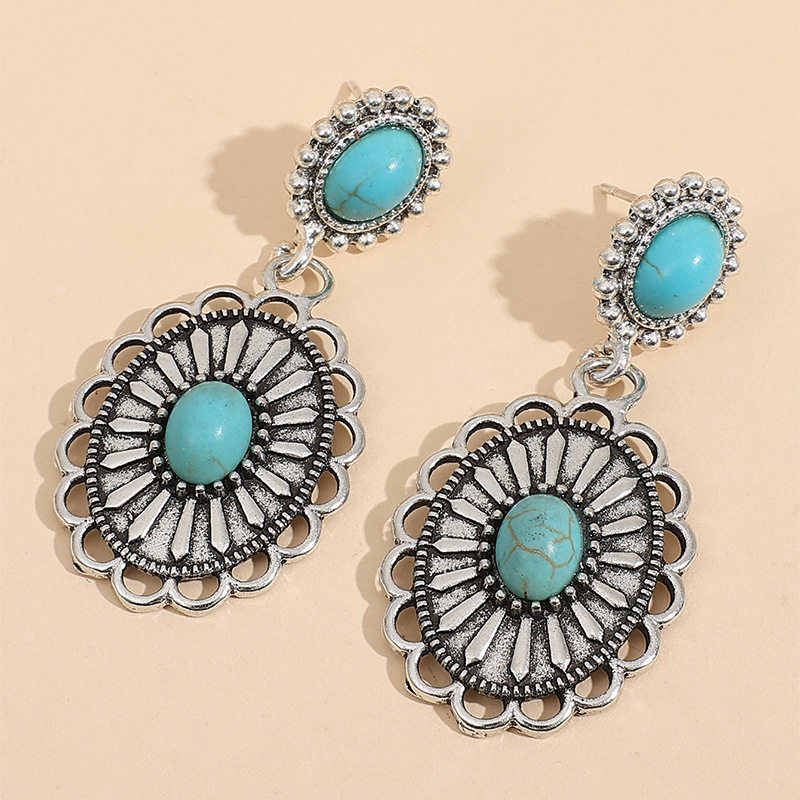 3E3C Vintage Oval Carved Turquoise Studs | Bohemian Ethnic Waterdrop Dangle Statement Jewelry