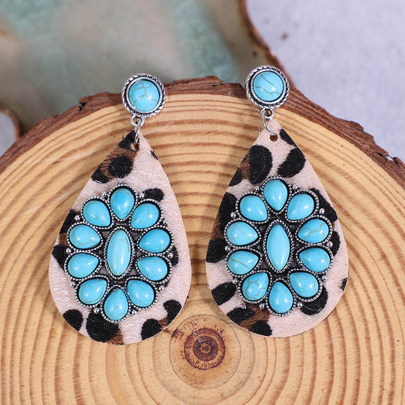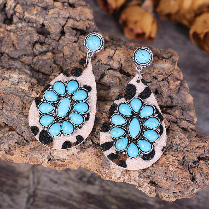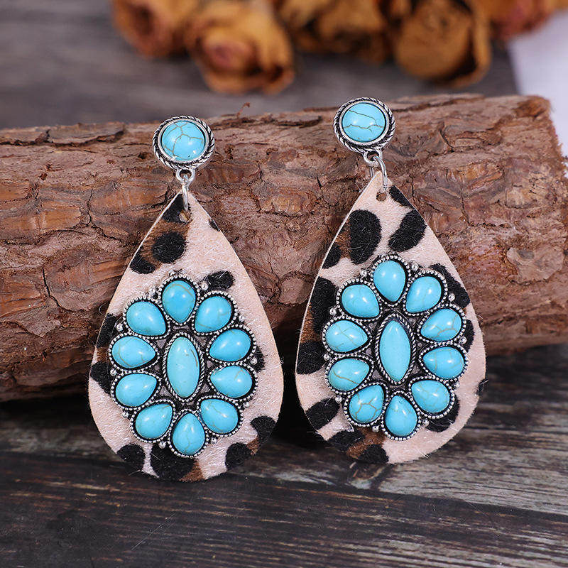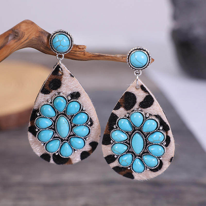 3E3C Vintage Turquoise Horsehair Leopard Print Earrings | Waterdrop Leather Statement Jewelry for Women