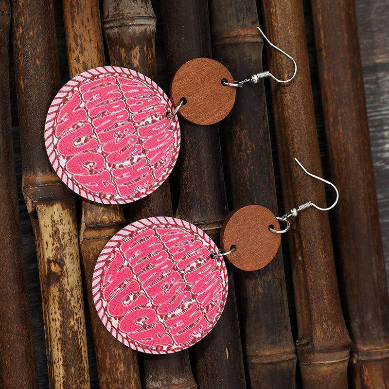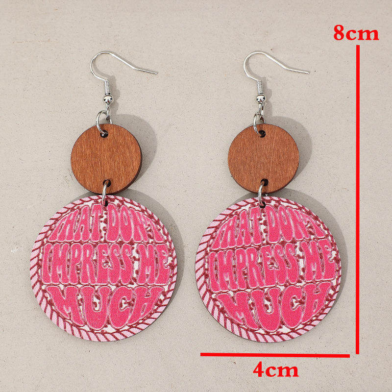 3E3C Western Pink Letter Leather Earrings | Trendy Round Statement Dangle Earrings