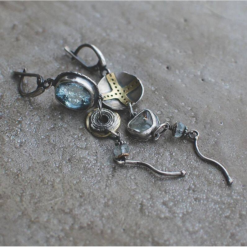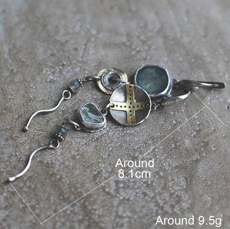 Asymmetrical Long Dangle Earrings for Women | Tribal Style with Sky Blue Stone Cross Round Metal Vintage Jewelry