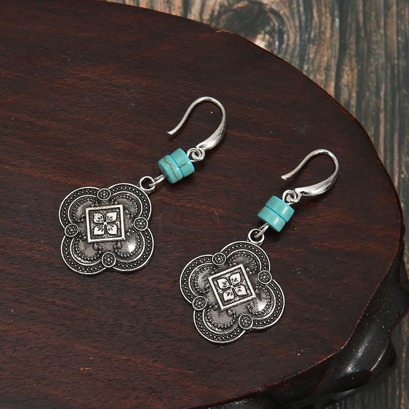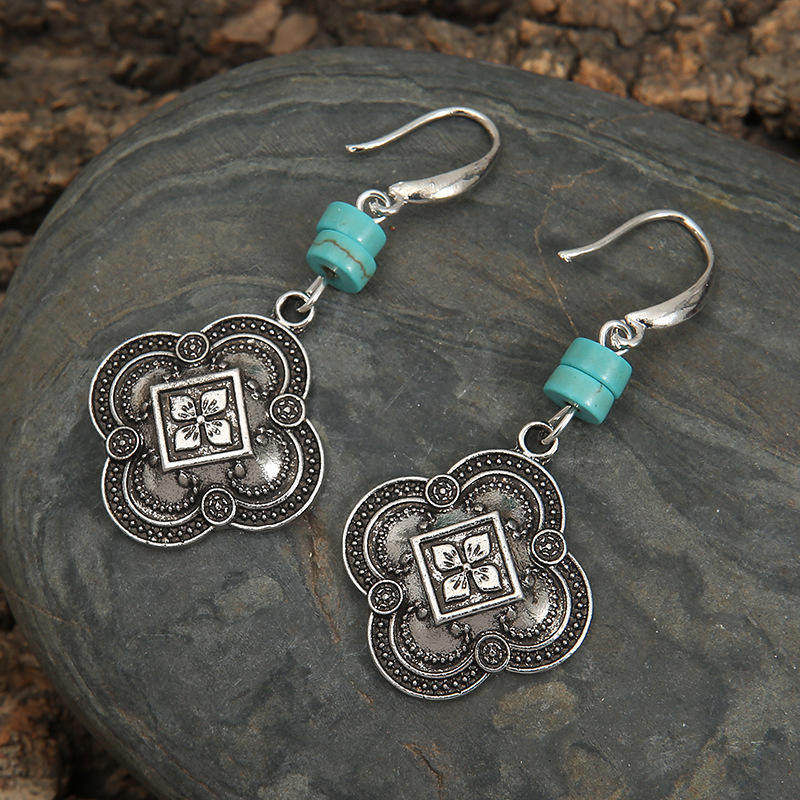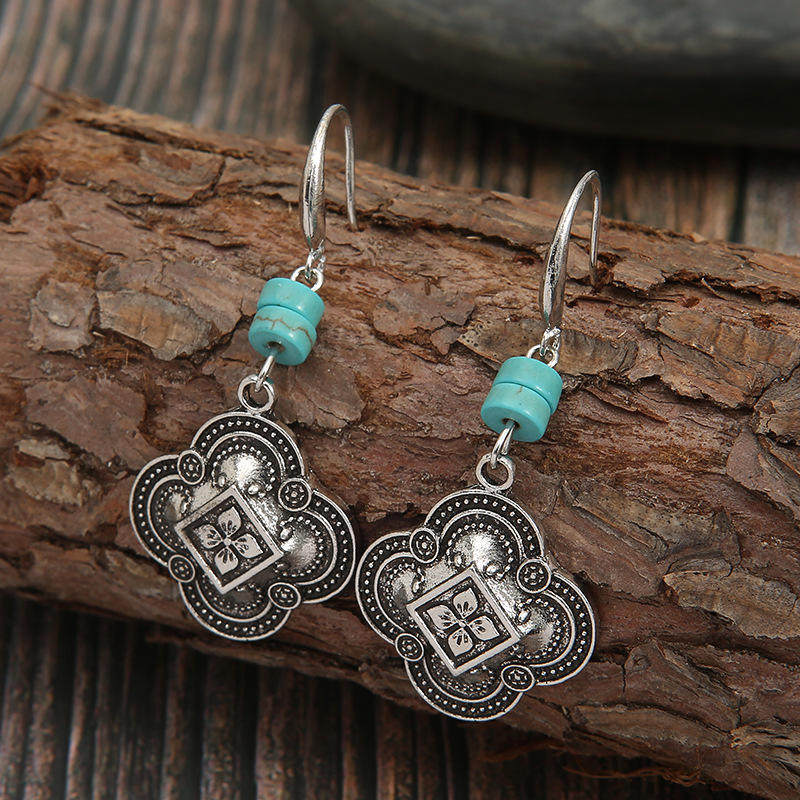 Bohemian Beaded Turquoise Earrings Vintage Auspicious Carved Drop Jewelry for Women