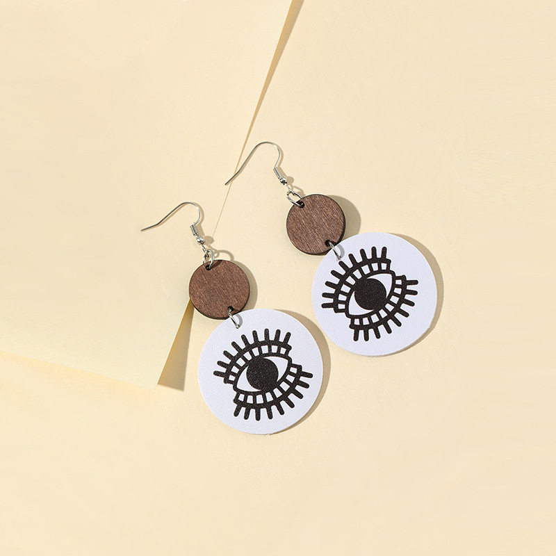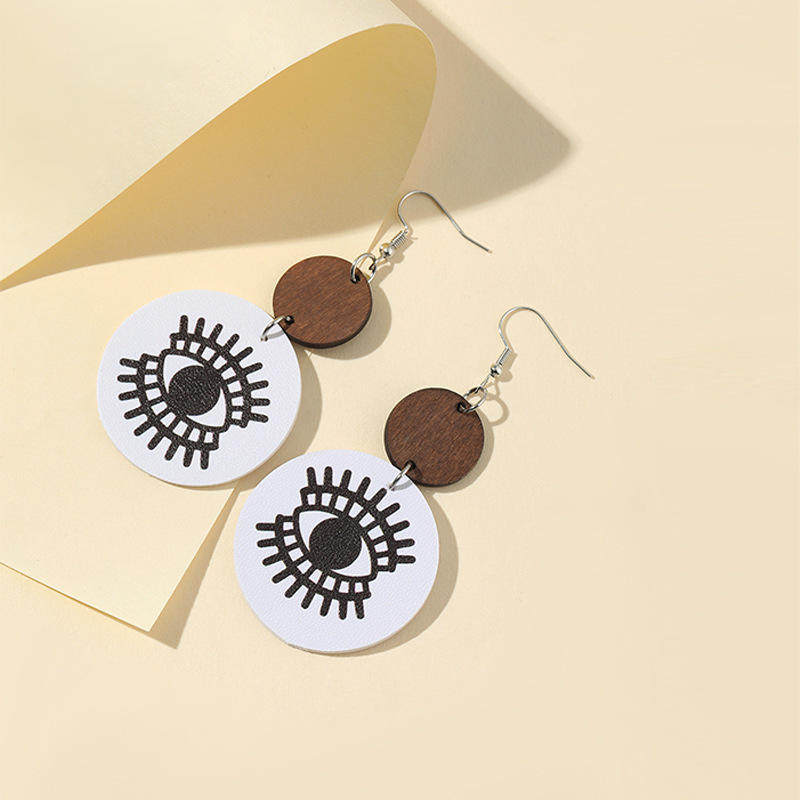 Bold Round Wood Slice Leather Patchwork Earrings Turkish Evil Eye PU Double-Sided Dangles