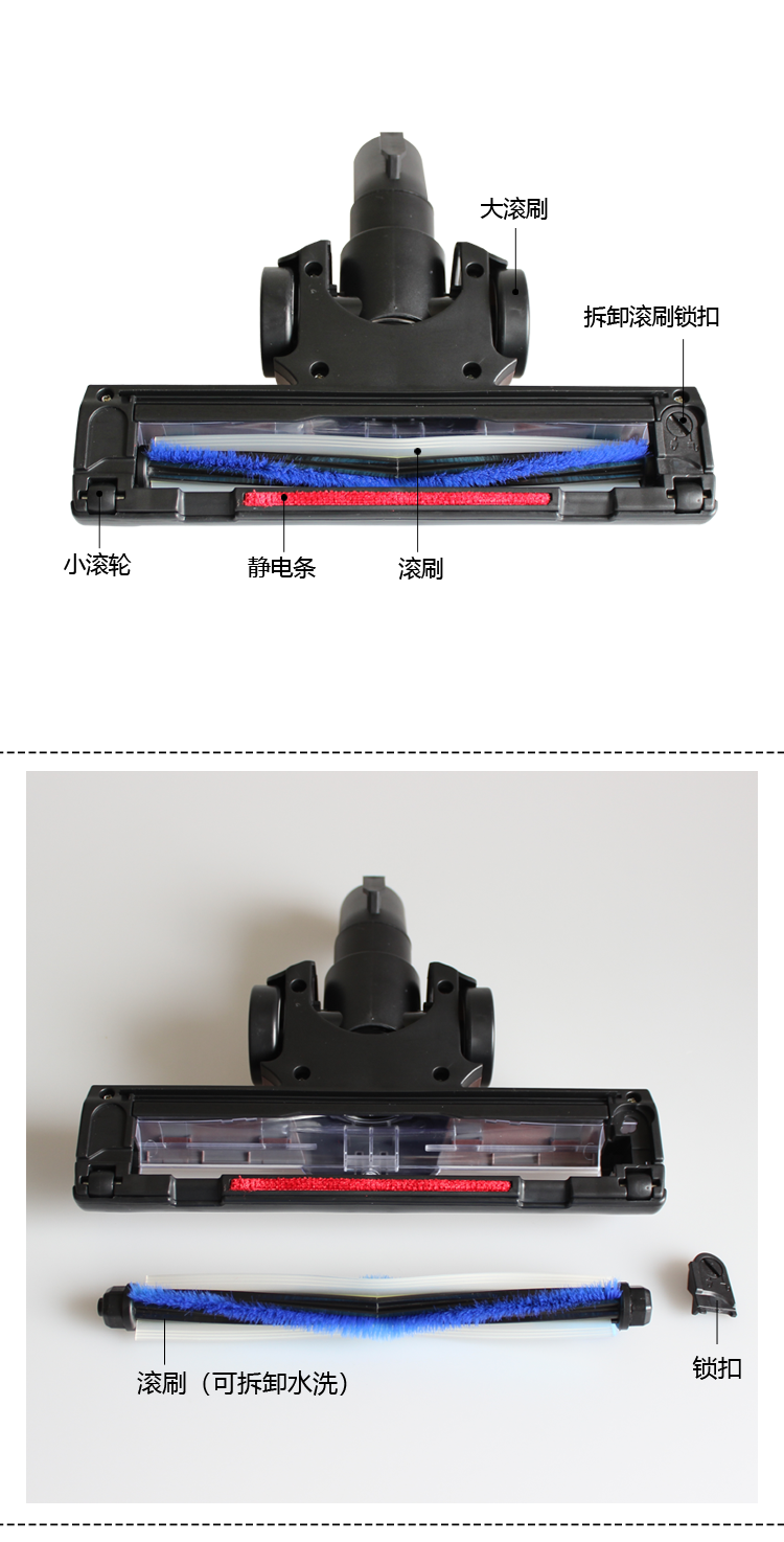 [Function] Air-powered rolling brush driven by vacuum suction to assist in deep dust removal on floors and carpets.
