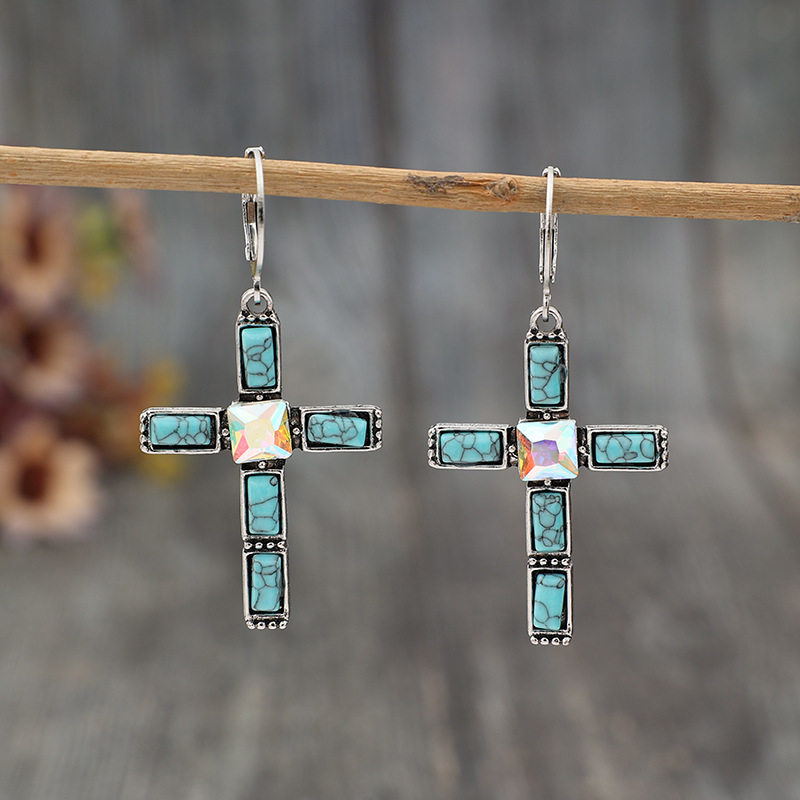 Vintage Cross Turquoise-Inlaid Earrings | Bohemian Long Dangle Jewelry