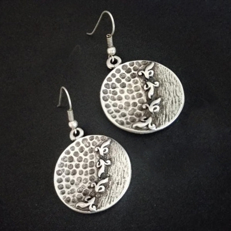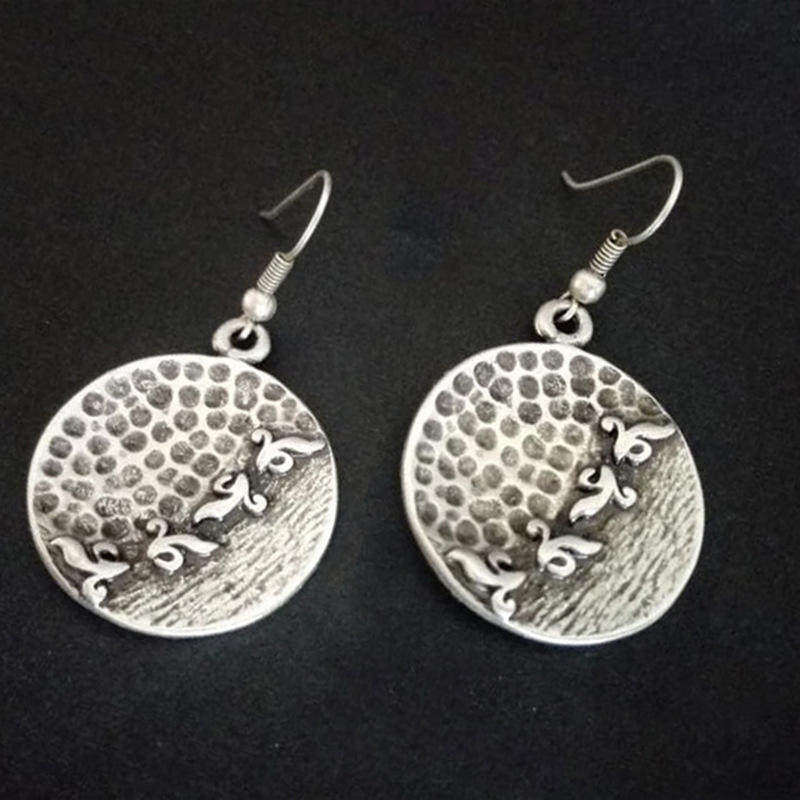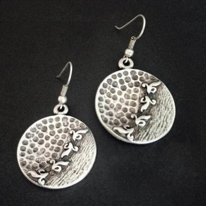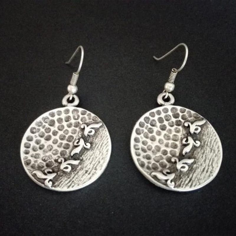 Vintage Ethnic Style Hammered Distressed Earrings Geometric Round Thai Silver Carved Jewelry