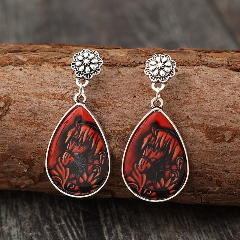 Western Style Teardrop Patchwork Pumpkin Flower Earrings | Ethnic Vintage Carved Horse Alloy Jewelry